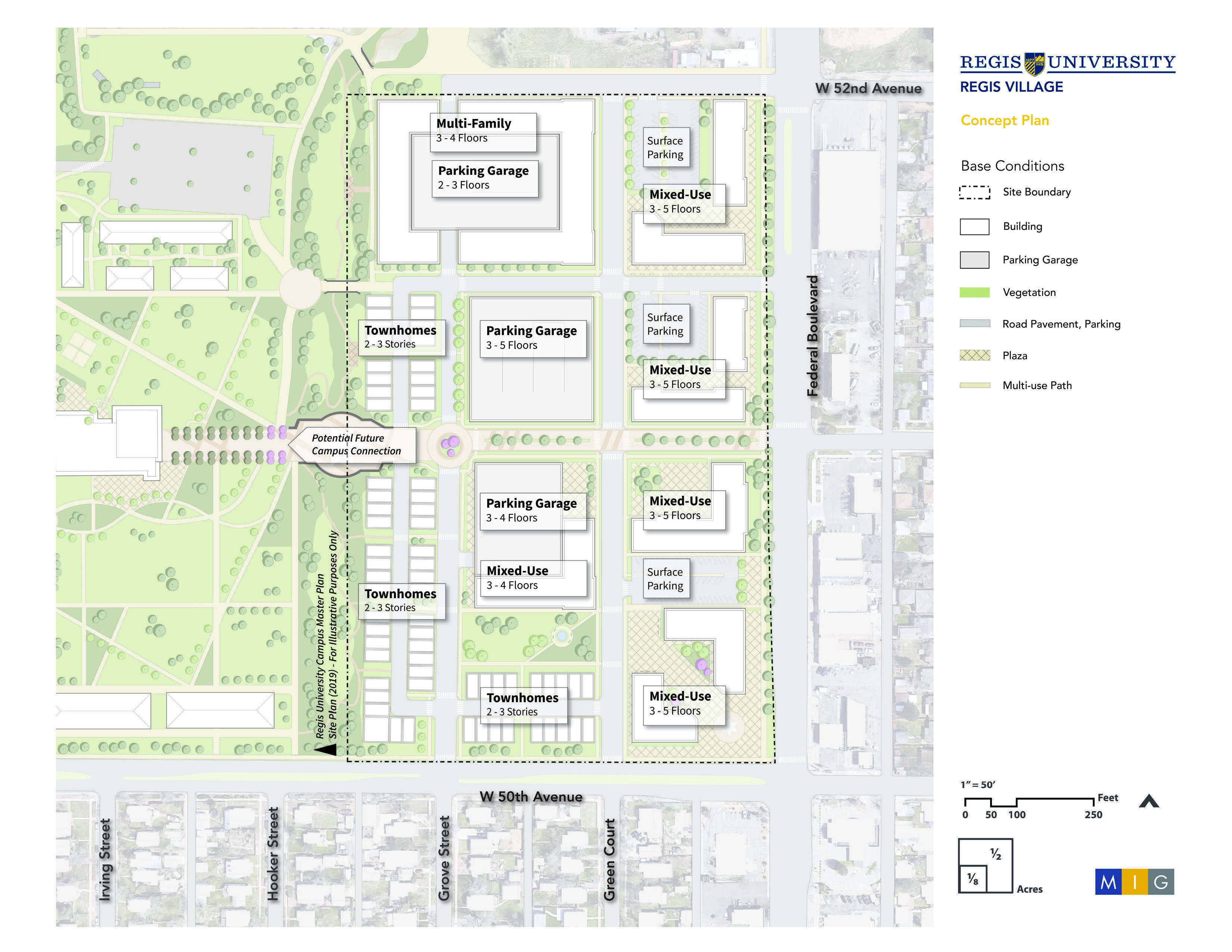 Documents received from Regis University representatives via email in advance of the public hearing on 12/5/25: Regis Village Concept Review 2021; Concept Plan (image); Regis Village CIM Summary; Regis Village Presentation on PUD Updates to BRUN; Regis Village LDR Framework. UPDATE: The rezoning application was unanimously approved by City Council on 12/8. Read an article by Denverite about the hearing here. Watch the City Council meeting recording here. The Regis Village public hearing starts around hour 4, minute 8.