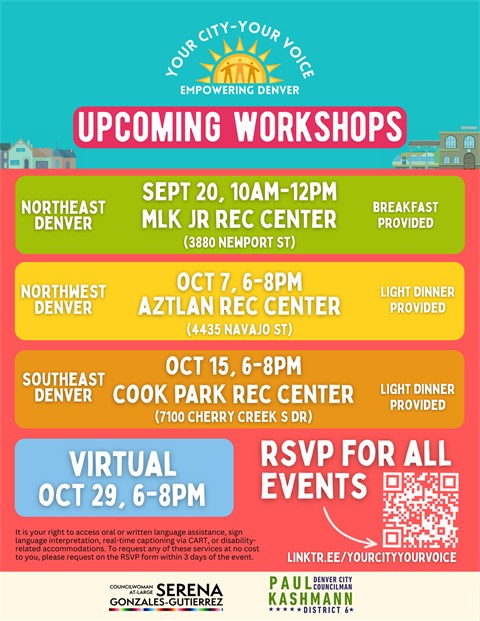 Tuesday, October 7, 2025: Neighborhood Engagement Workshop (Check out the Facebook Event page; this event is organized by Denver City Council members)
